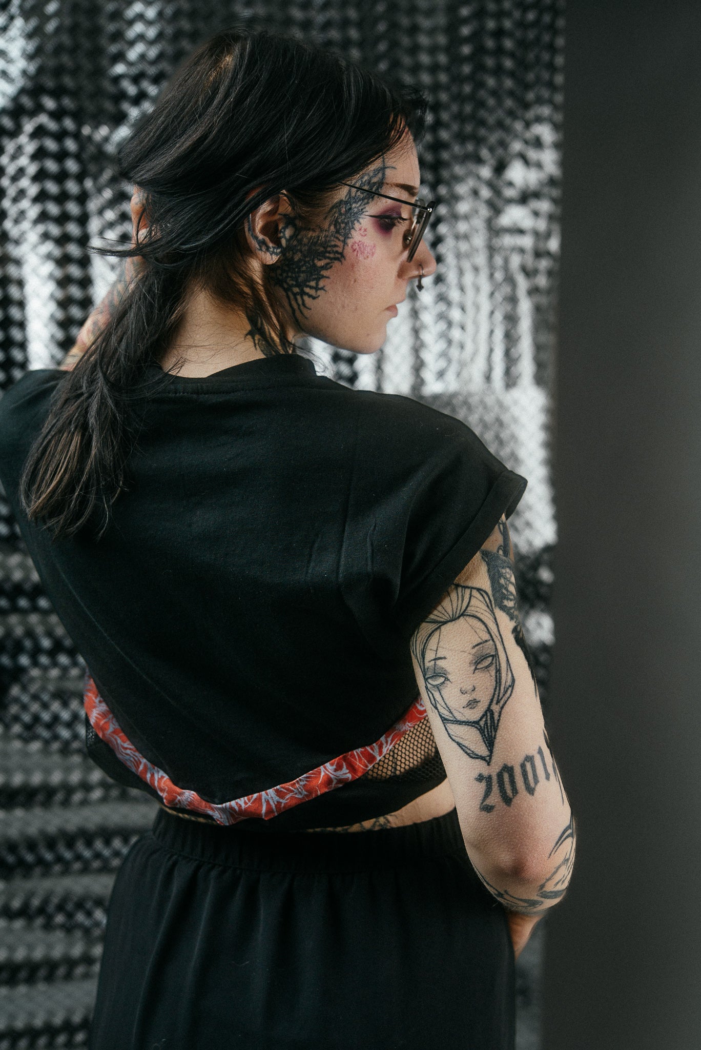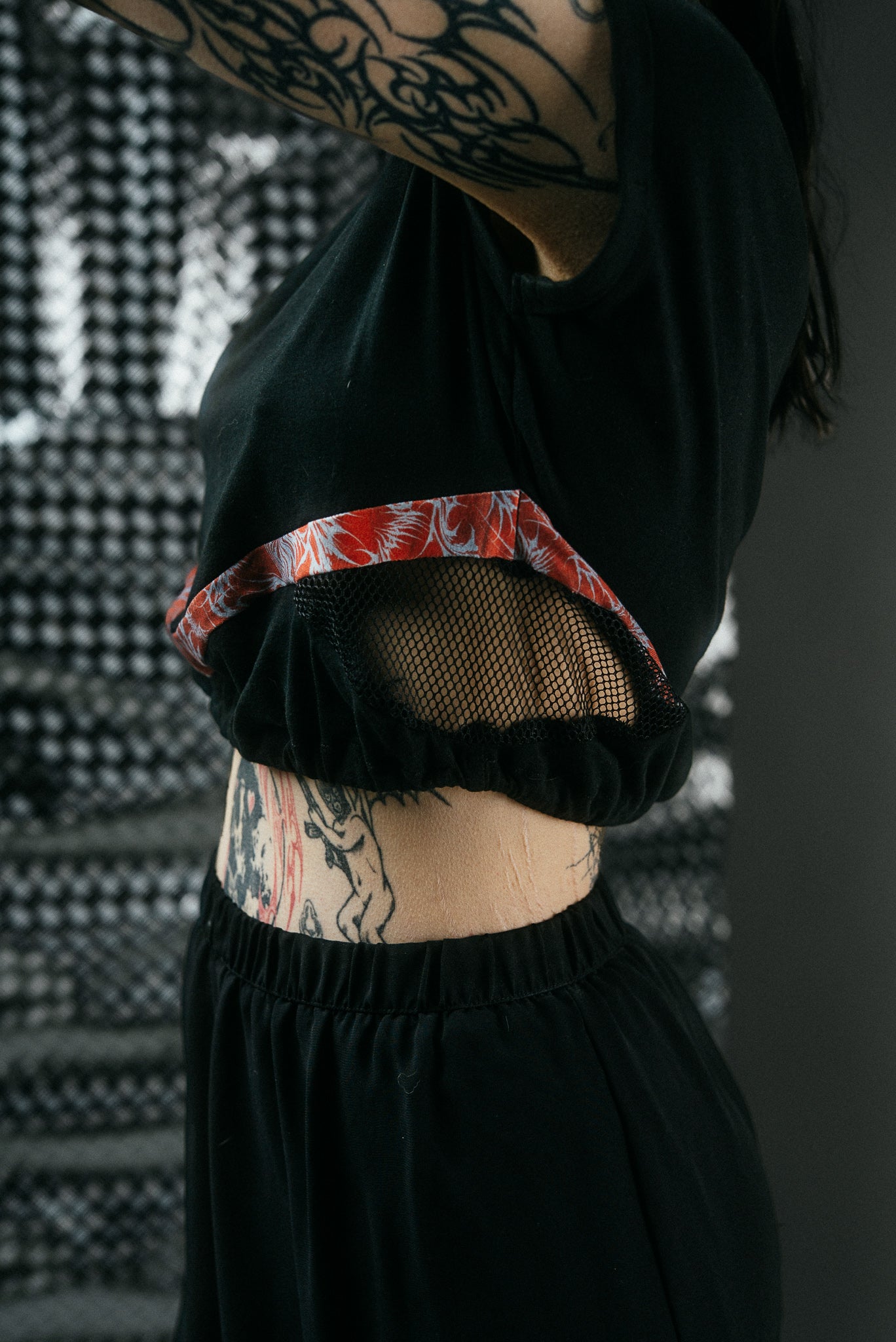 A bold black crop top reimagined through upcycling and handcrafted detail. Designed with a YH fabric insert that adds contrast and character, this piece balances streetwear attitude with functional comfort. Elasticated elements at wrist level create structure and flexibility, making the silhouette dynamic yet easy to wear. Each garment is individually treated through in-house bleaching and dyeing, ensuring a truly one-of-a-kind finish.