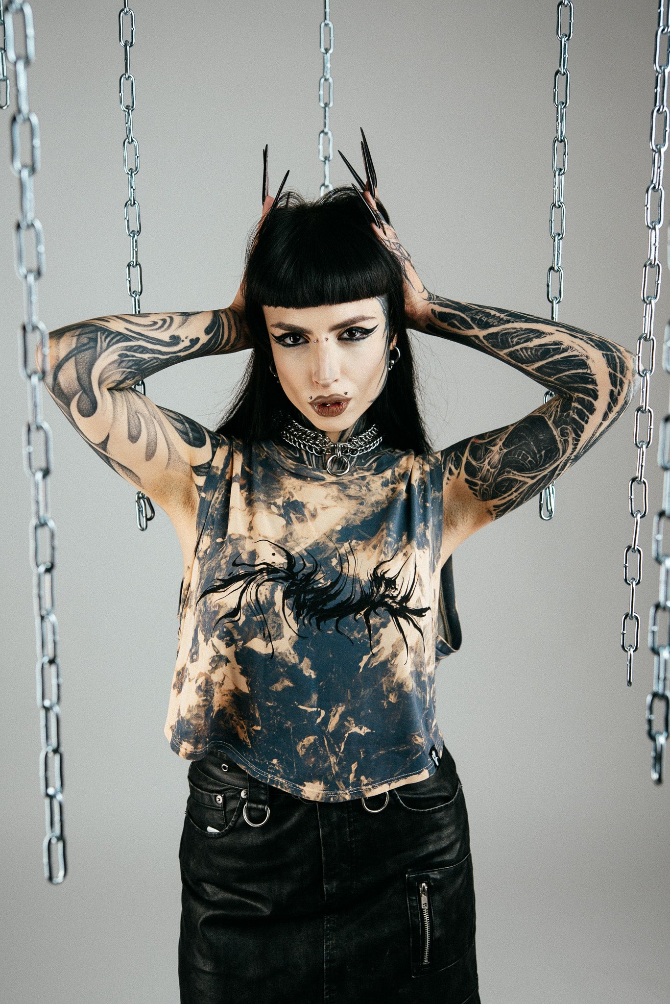The top is hand-colored and bleached individually, creating natural variations in tone and texture. Every piece is a one-of-a-kind, upcycled garment that celebrates creativity, individuality, and conscious design.