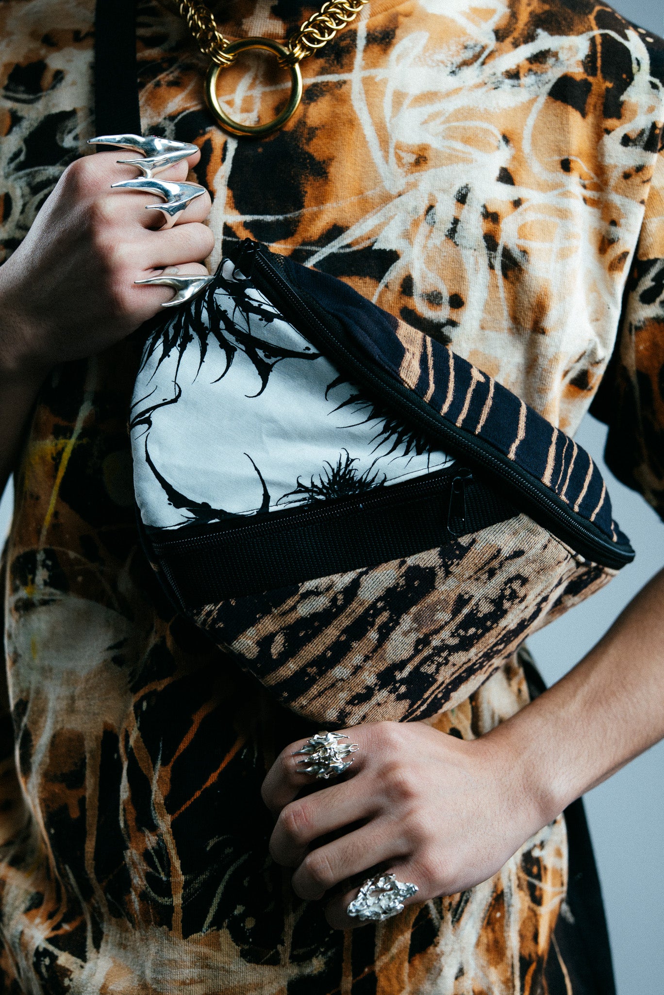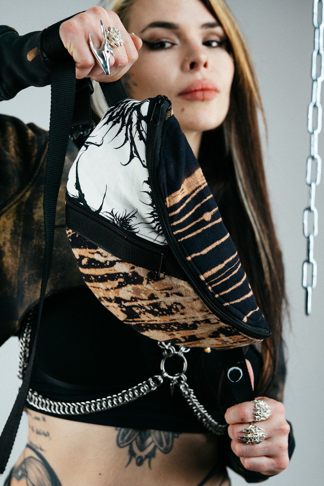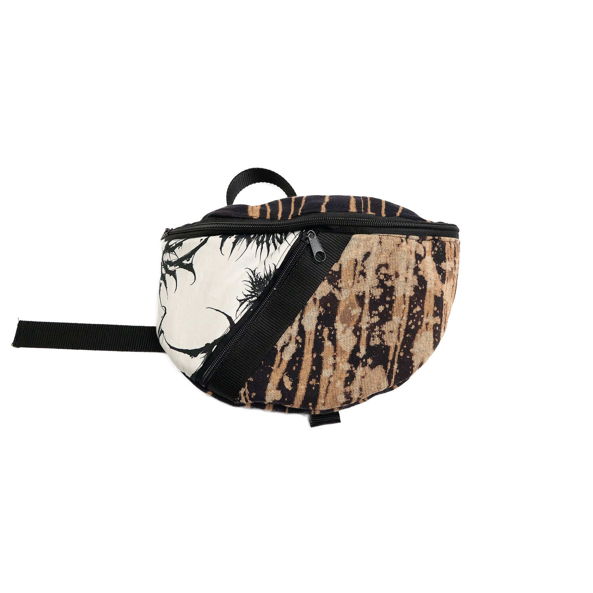 Each fannypack is handmade from reclaimed fabrics, with unique bleaching and coloring effects that make every piece one-of-a-kind.