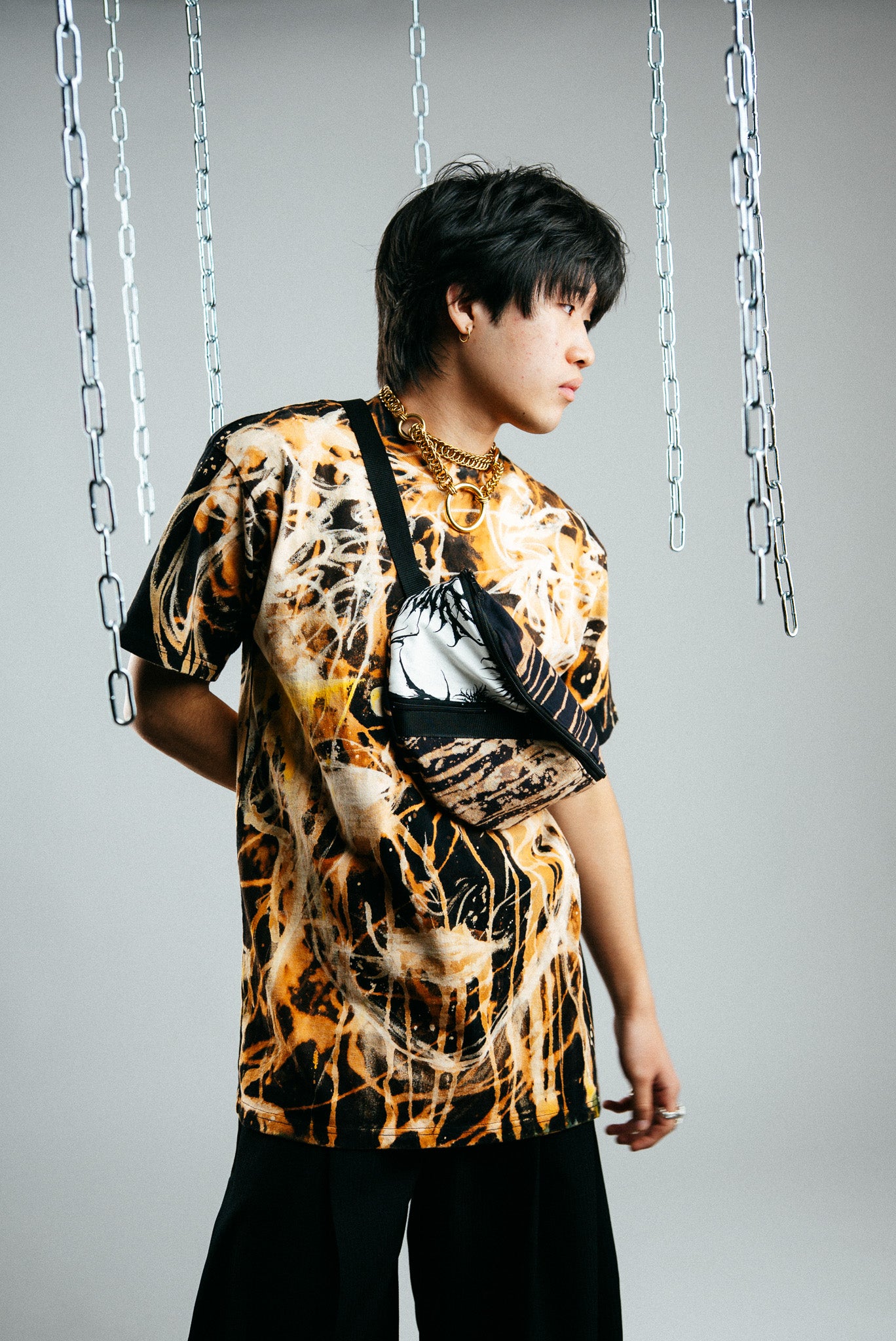 A bold, handcrafted fannypack made entirely from upcycled materials. The front features a Liquid Death patch, while the back is bleached and hand-colored in red, creating a striking contrast. Each piece is unique, reflecting both sustainable design and urban artistry.