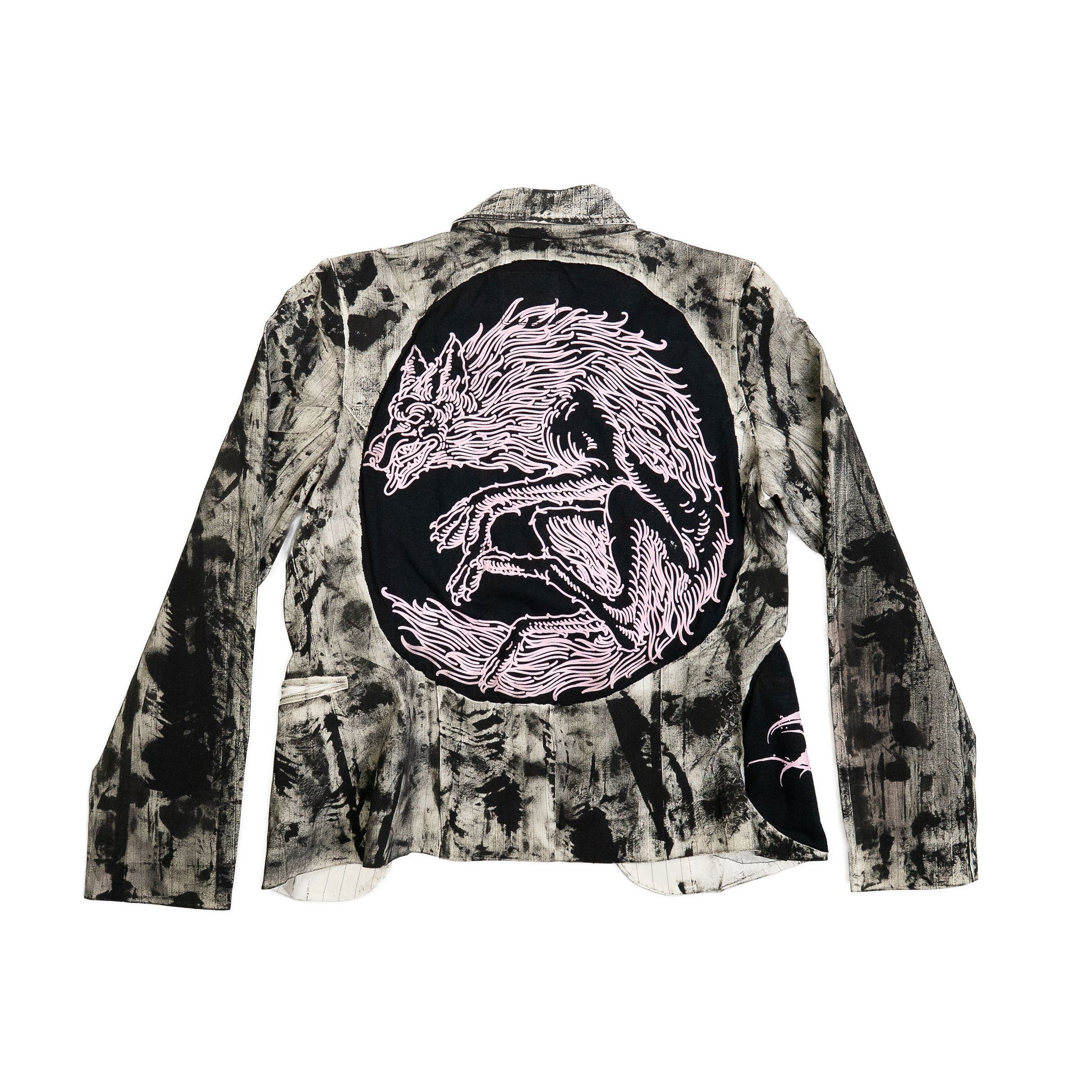 A one-of-a-kind, hand-painted blazer where each stroke tells a story. Featuring sewn-on Younghearted patches and metallic details, this piece transforms reclaimed materials into a bold, expressive garment. Its black and pink color palette and artisanal construction make it a statement piece that blends creativity with sustainable fashion.