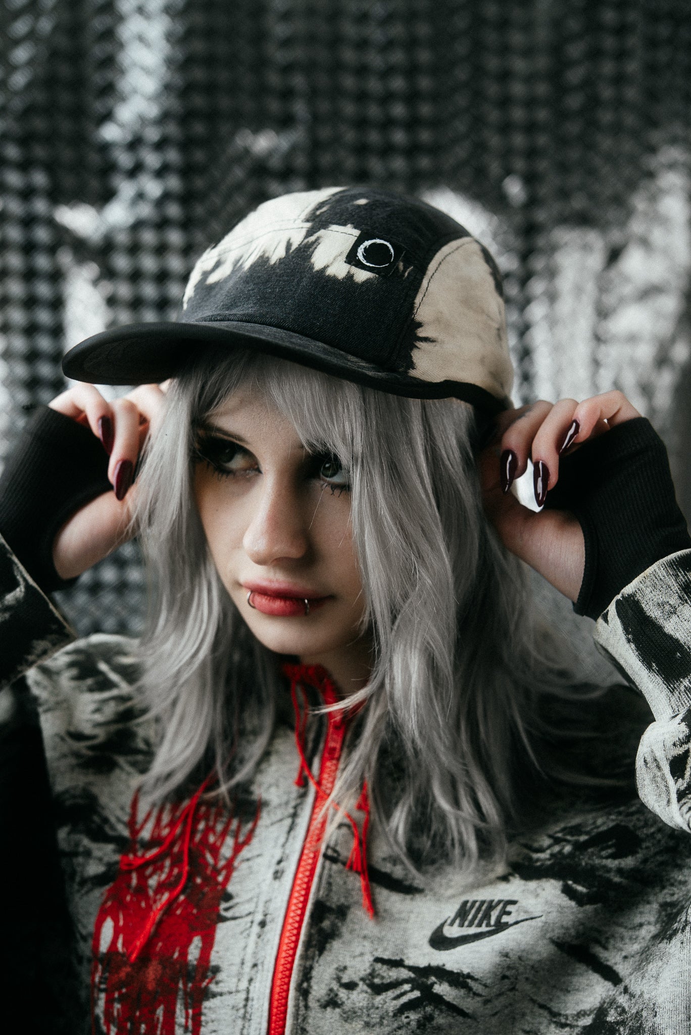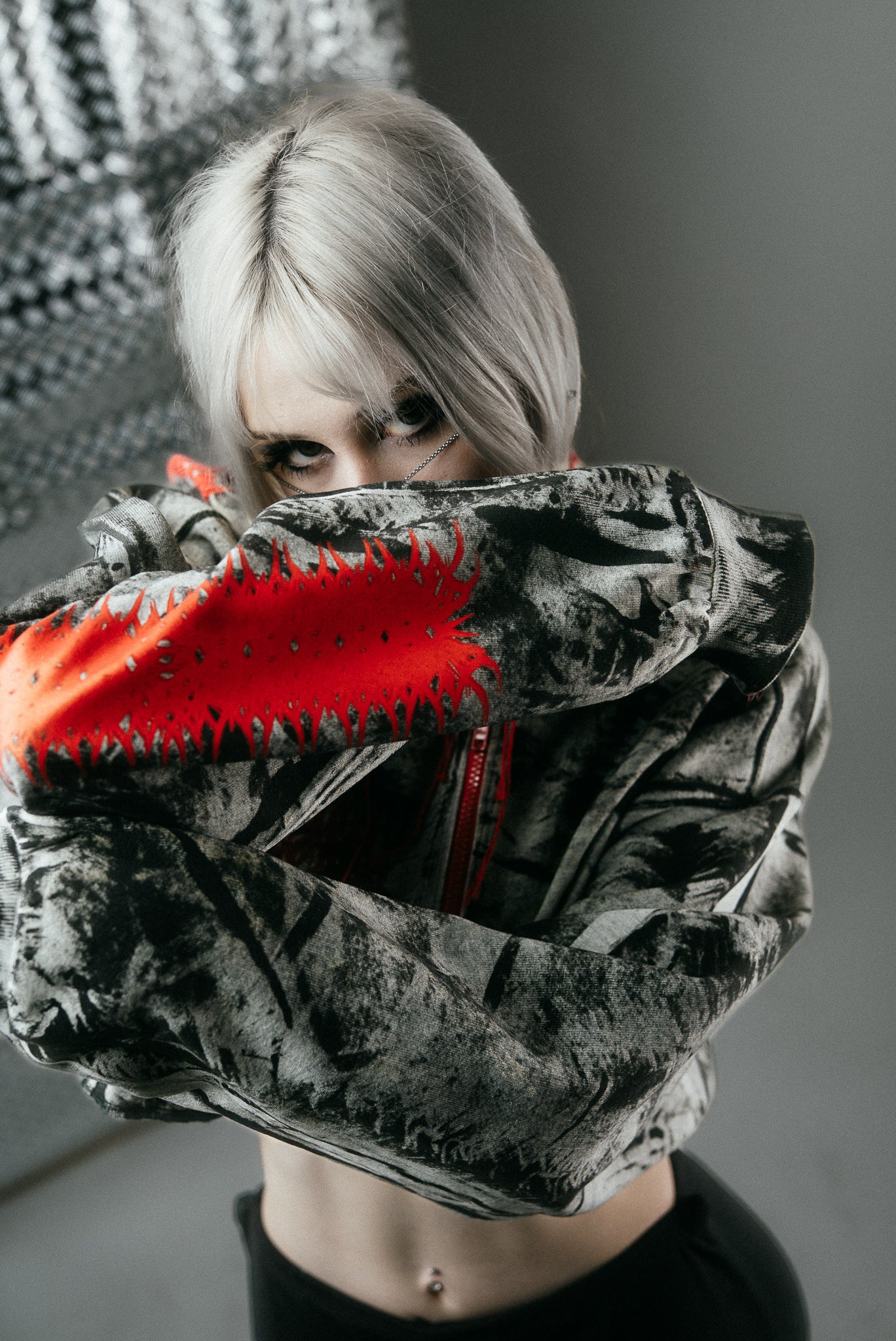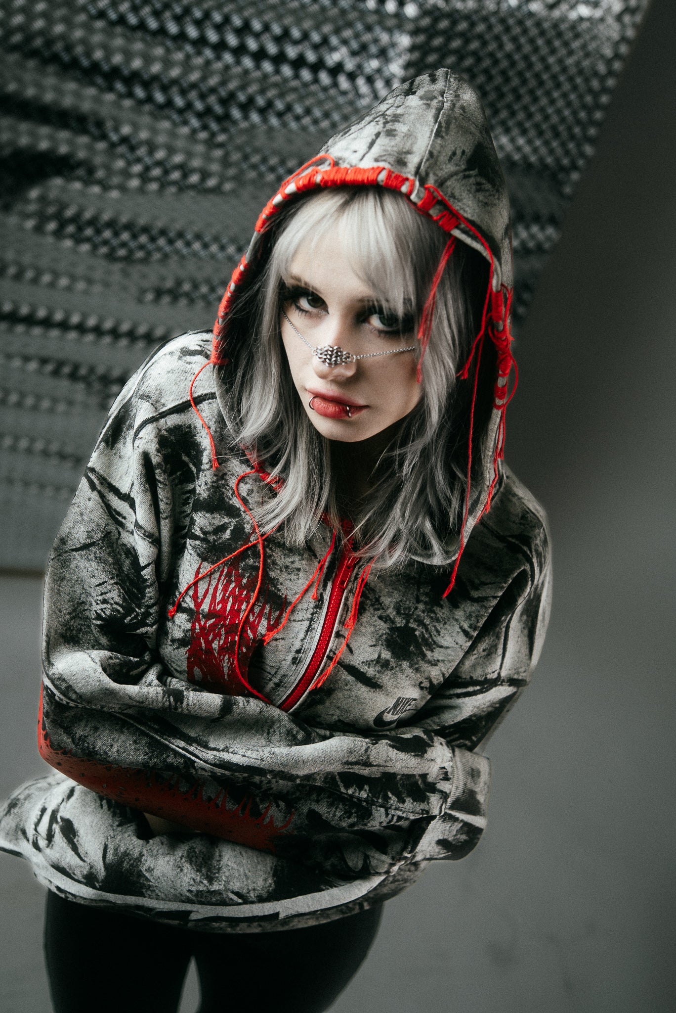 An upcycled Nike zipper hoodie transformed into a bold, sculptural statement piece. Cropped with a sharp silhouette, it features a striking red zipper, hand-painted layers, and screen-printed red designs by REVA × YH. Sewn-on red accents add dimensional detail, while each brushstroke marks a trace of transformation. Every hoodie is entirely handmade, ensuring that no two are alike.