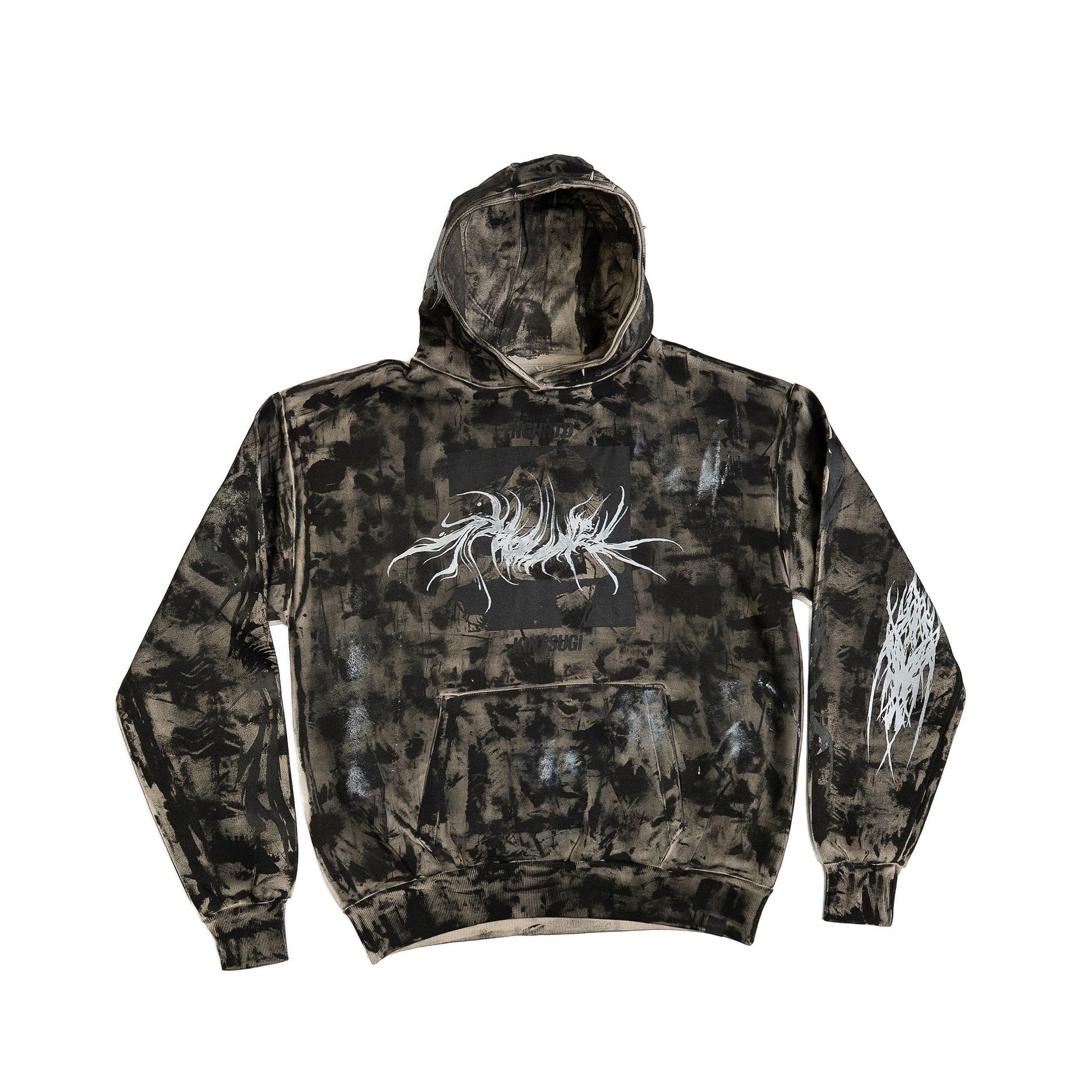 A one-of-a-kind, hand-painted oversized hoodie where each brushstroke tells a story, inspired by the philosophy of Kintsugi — celebrating imperfection and transformation. The piece features silver screen-printed YH and REVA designs and a spiked hood, combining bold streetwear aesthetics with conscious craftsmanship. Bleached and dyed in-house, each hoodie is individually treated to create a unique garment that embodies both expressive artistry and sustainable design.